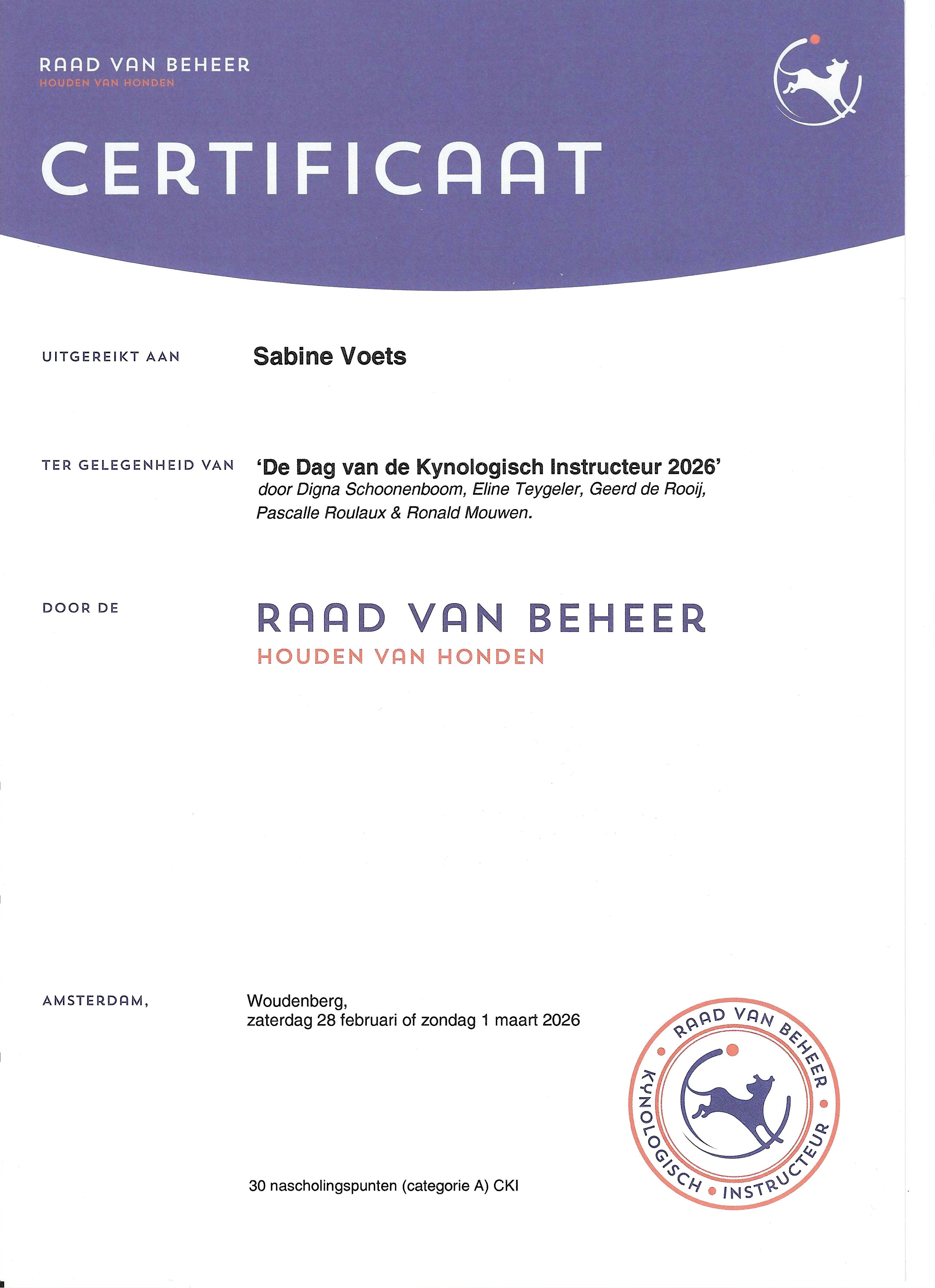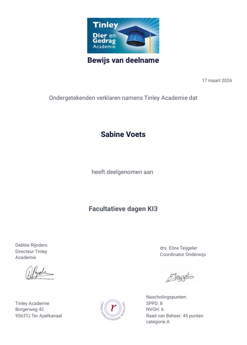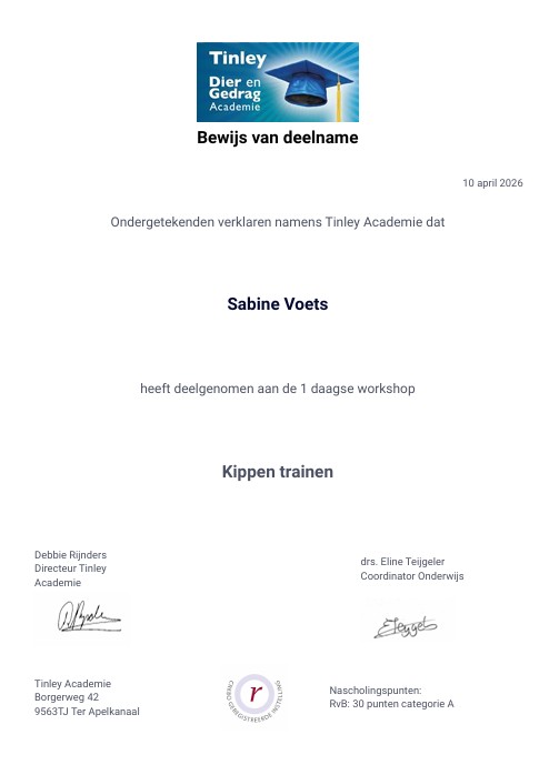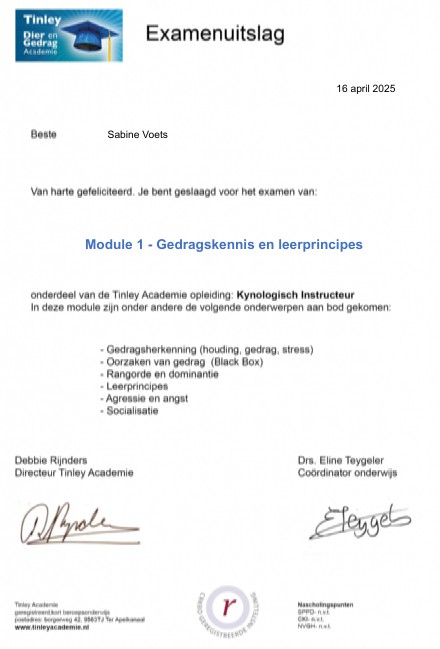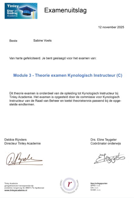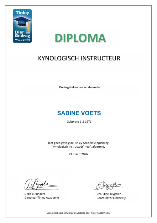 Ik heb de opleiding tot kynologisch instructeur met succes afgerond. Aansluitend ben ik bezig met de opleiding Neuswerk met de hond. Hondenschool de Zandkant is open voor de gehoorzaamheid en binnenkort starten de detectie lessen op de hondenschool. Ik heb een eigen afgesloten terrein bij ons huis waar de lessen plaats vinden. Het zal kleinschalig zijn om zo de rust en het plezier voor de honden en de begeleiders te waarborgen. Ook opent binnenkort Snuffeltuin de Zandkant. Meer daarover vind je op de website!
